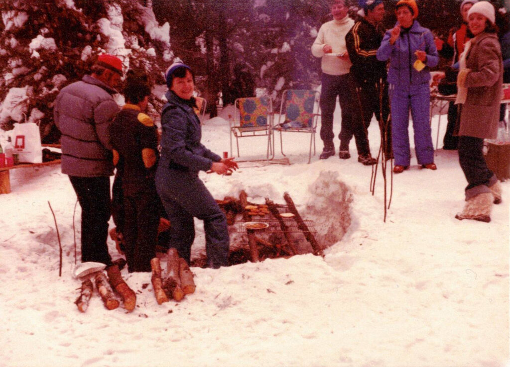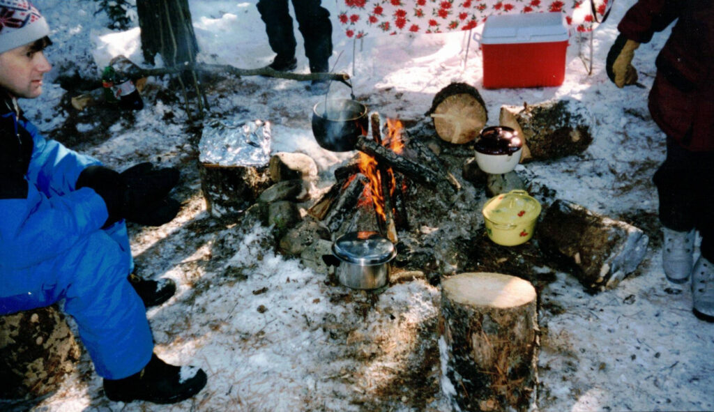 Oui, 50 ans passés ici à découvrir cet environnement dans lequel la forêt prend tout son sens. Mon père, homme de partage et de générosité, nous transmet cet héritage qu’il a vécu durant sa jeunesse. Je pars avec lui à la découverte de ce qui sera plus tard sans le savoir mon travail, mon métier, ma passion. Ma mère, elle, me transmet ce goût de la cuisine. J’aime aussi rigoler en expliquant que ma grand-mère paternelle, « cook de chantier », m’a sûrement transmis de ses gènes qui me permettent d’explorer la cuisine sur feu de bois. À vrai dire, depuis que je suis toute petite, mes parents et grands-parents organisaient ici à St-Côme des pique-niques hivernaux lors desquels nous mangions patates dans la braise, fèves au lard, jambon et bien plus. Mon père nous préparait l’infusion de branche de sapin faite à partir de la neige et de petits bouts de branches prélevés sur place qui ensuite sera infusée directement sur le feu.