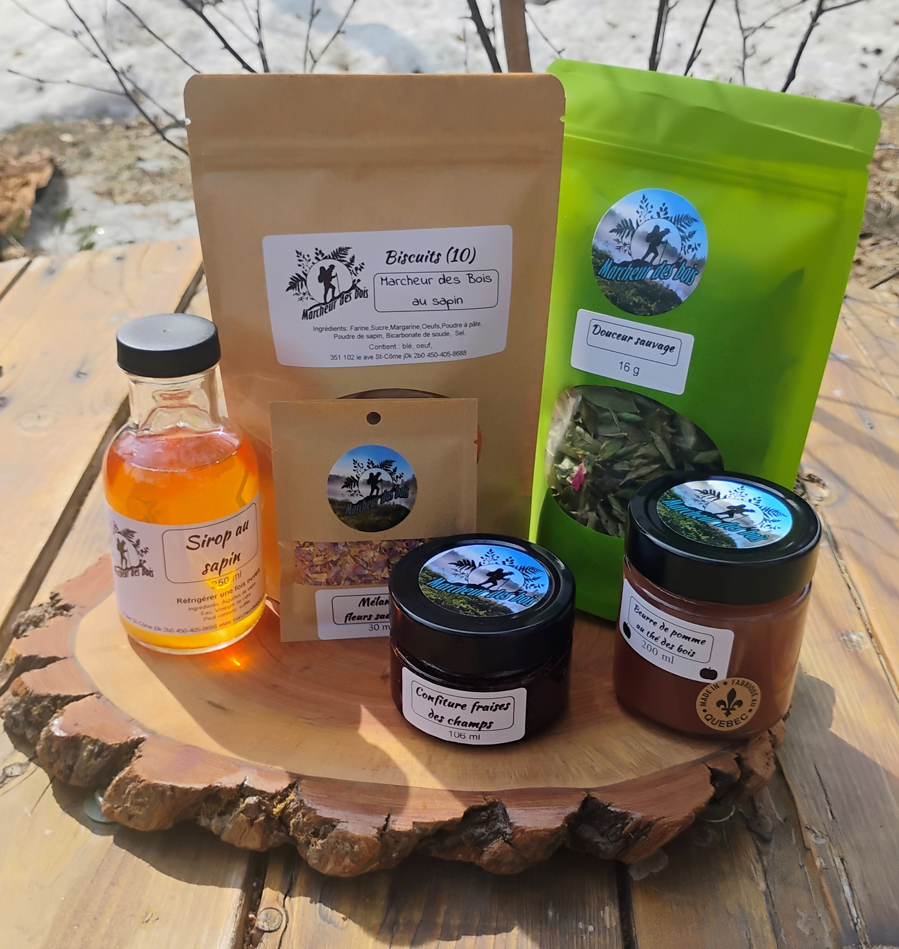 Découvrez six produits forestiers uniques préparés à Saint-Côme, chez Marcheur des Bois. Tisane Doux Repos, Sirop de sapin 250 ml, Beurre de pomme au thé des bois 200 ml, Confiture de petites fraises des champs 100 ml, Biscuits Marcheur des bois au sapin (10), Mélange fleurs sauvages.