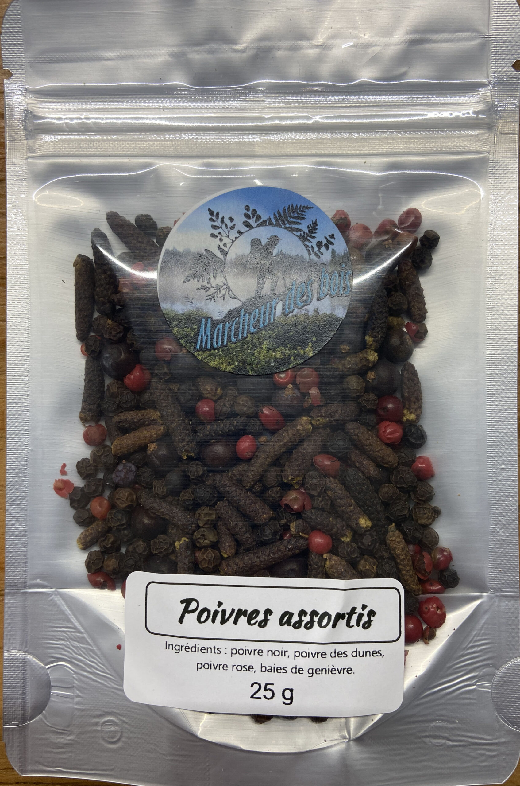 Ingrédients : poivre noir, poivre des dunes, poivre rose, baie de genièvre.